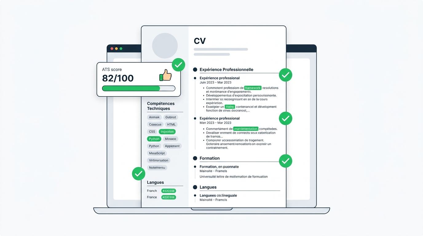 Vous pouvez analyser votre CV et votre lettre sur CVAdapt avant d'envoyer la moindre candidature. L'outil identifie les mots-clés manquants de l'offre, indique dans quelle section les placer, et calcule votre score en temps réel.
